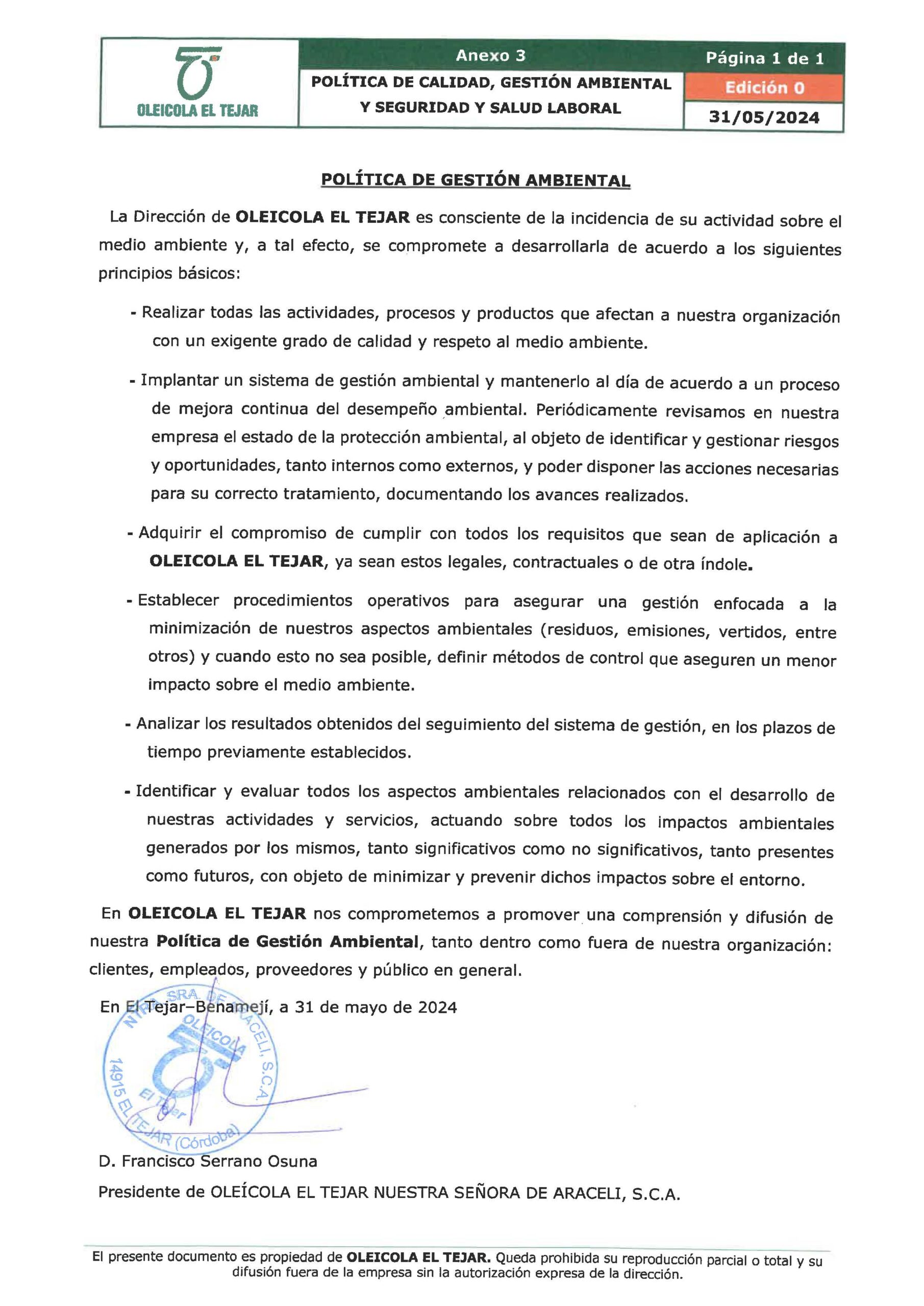 Oleicola el Tejar renueva su certificación bajo el SUSTAINABLE RESOURCES Verification Scheme GmbH cumpliendo con las exigencias de la Directiva de Energías Renovables (UE) 2018/2001, norma europea que establece exigentes criterios que debe cumplir la biomasa empleada en la generación eléctrica.